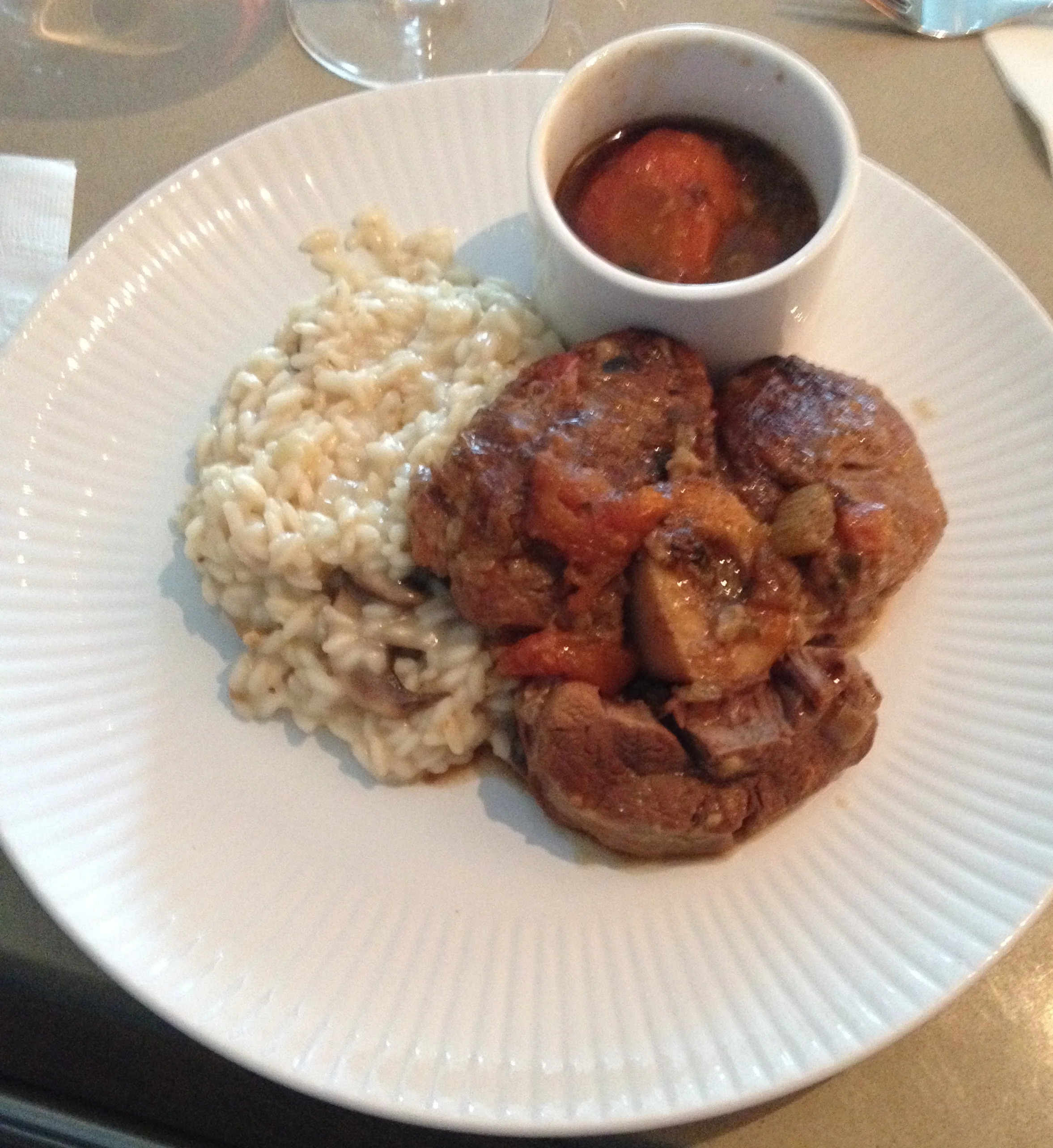 Stir in the remaining 2 Tbsp butter, the parmesan cheese and season with salt. Make sure to try it first because the parmesan will add a lot of salt. Serve immediately as risotto can turn glutinous if it sits for too long. Remember your risotto should be creamy but it should not be too runny or thick, as shown below with my osso bucco (recipe to follow). Add parsley for garnish if you like.